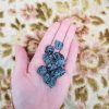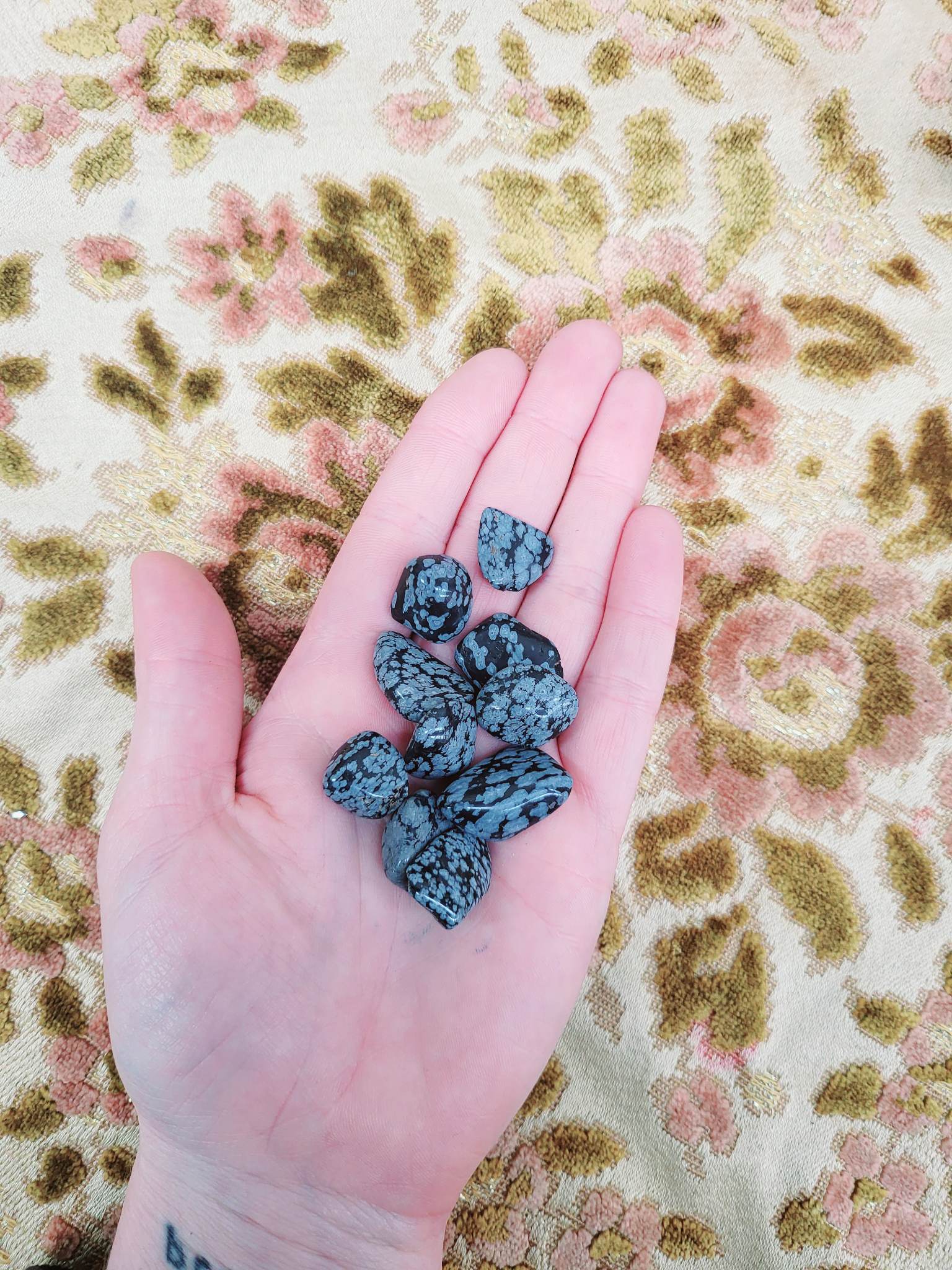 The distinctive white patterns across the surface of snowflake obsidian are very small radial clusters of cristobalite, formed as the obsidian cooled more slowly, allowing crystalisation.